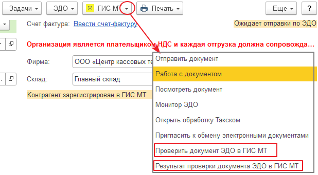 В документы «Расходная накладная, «ЭДО Сверка поступления», «Возврат комитенту», «Расходная накладная реализации», «Возврат поставщику», «Счет фактура выданный», «Счет фактура полученный» добавлен в меню «ГИС МТ» пункт «Проверить документ ЭДО в ГИС МТ».