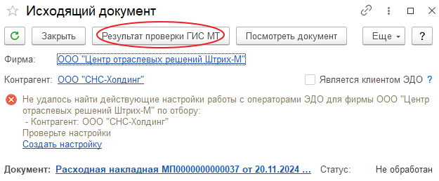 Кнопка «Проверить документ ЭДО в ГИС МТ» открывает форму предварительной проверки. Проверка доступен, в случае, если: