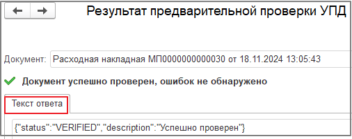 Если проверка завершена и ошибок в документе нет, при нажатии кнопки «Результат проверки документа ЭДО в ГИС МТ» открывается форма «Результат предварительной проверки УПД», в которой выводится текст «Документ успешно проверен, ошибок не обнаружено». При этом в табличной части формы выводится только закладка «Текст ответа».