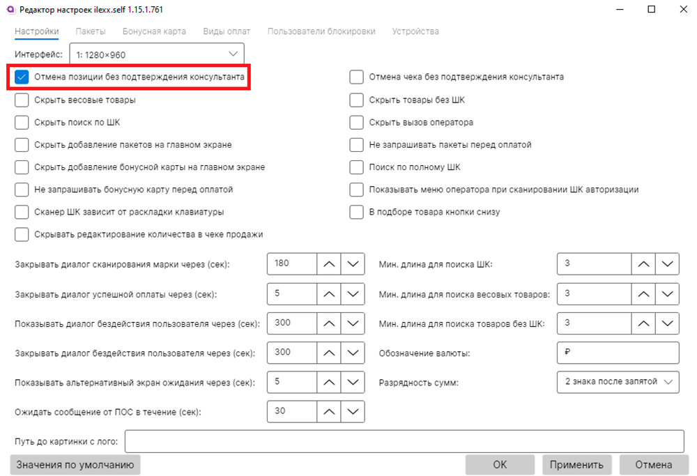 По умолчанию ilexx.self-checkout настроен на отмену позиций в чеке только после подтверждения консультанта.