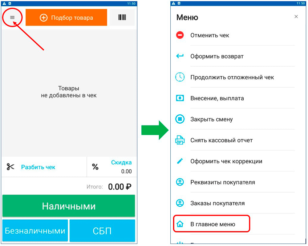 - Для этого, в режиме продаж, нажмите на значок меню в левом верхнем углу,