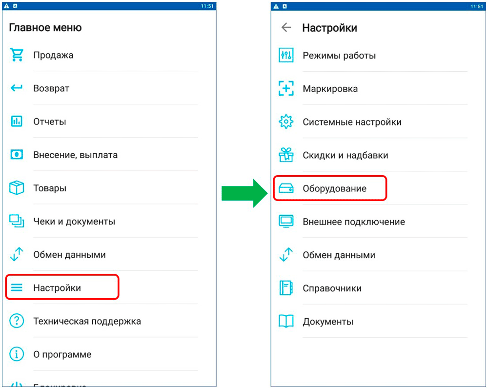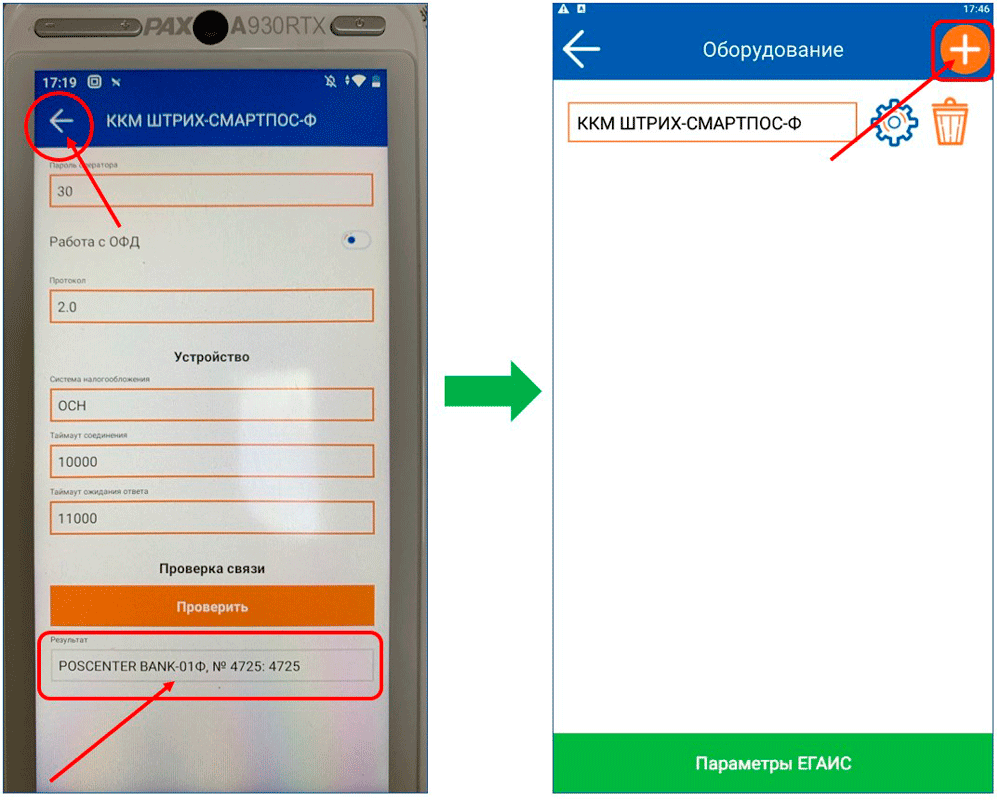 - Нажмите на стрелку в левом верхнем углу для сохранения настроек и возврата на страницу "Оборудование", где вы может продолжить добавлять его, например, эквайринг-терминал. А как это сделать, вы можете ознакомиться в данной статье.