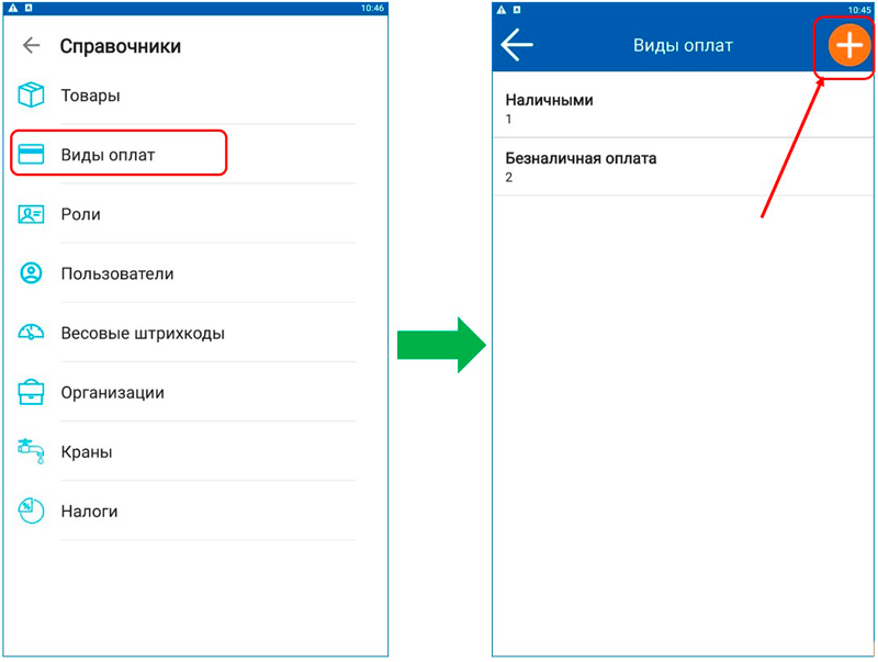 - Для создания нового элемента видов оплат - нажатием на "+" :