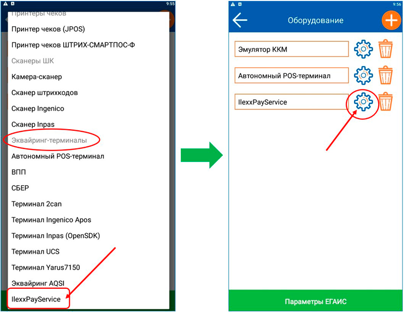 - В появившемся списке находите раздел "Эквайринг-терминалы", а в нем находите внизу "ilexxPayService" и нажимаете на него,