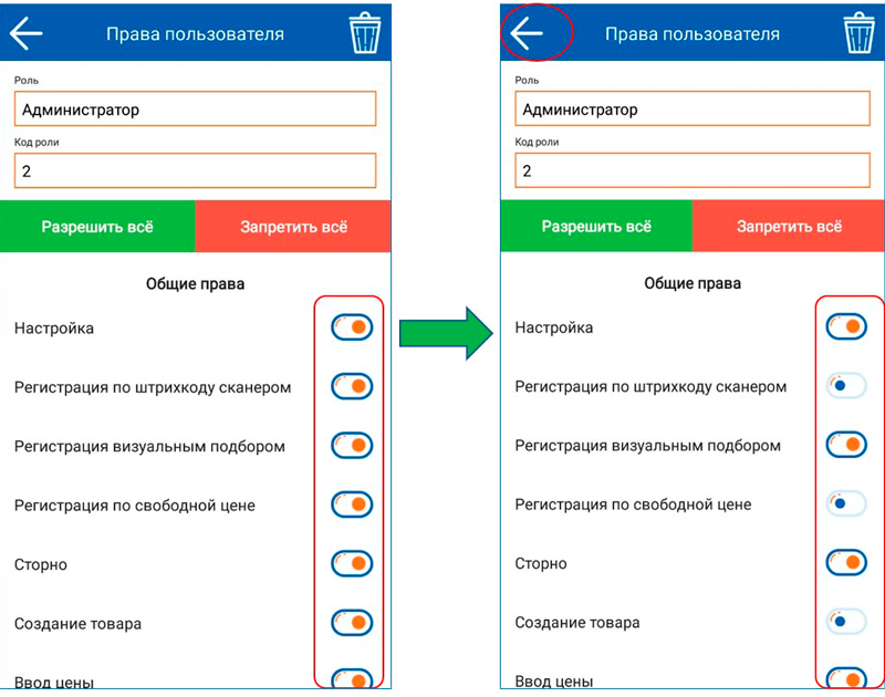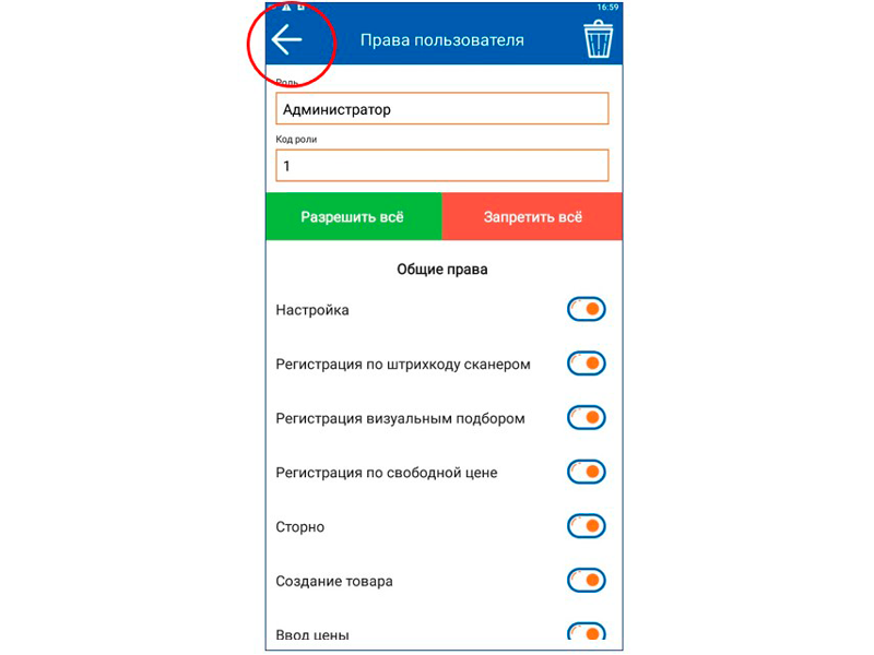 Создадим роль для примера роль Администратор, как представитель руководства, он должен иметь доступ ко всем правам: работе с документами, отчетами, продажами, поэтому разрешаем эму все права нажав на кнопку "Разрешить все":