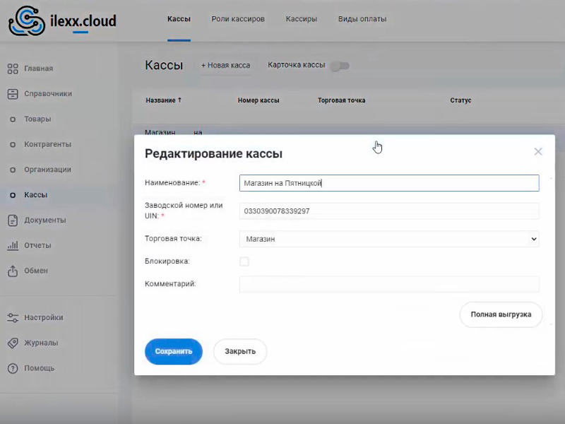 - Вводим название кассы для отражения ее в ilexx.cloud