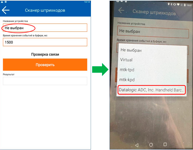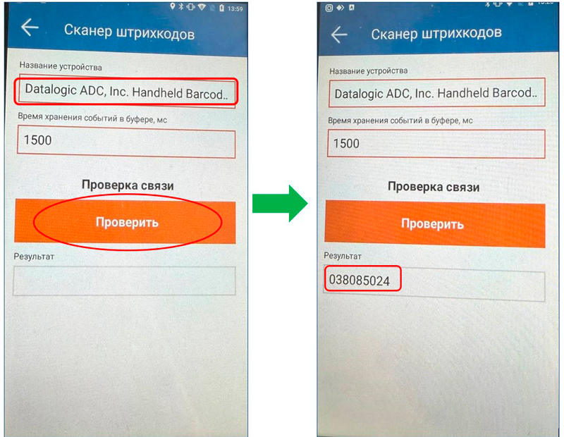 - Далее нажмите на кнопку "Проверить" для проверки связи и отсканируйте подготовленный штрихкод,