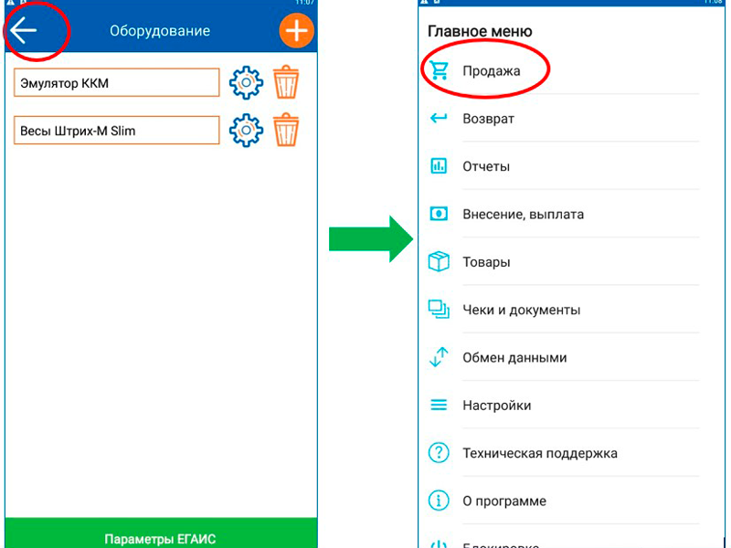 - Вернитесь в режим продажи, нажав на стрелку в левом верхнем углу два раза до Главного меню: