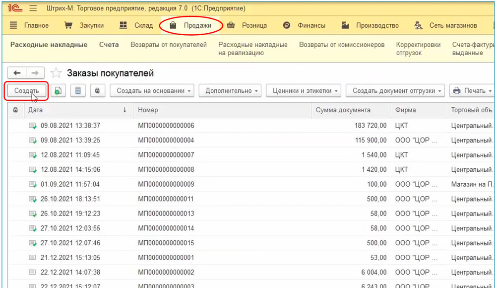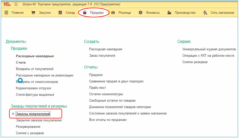 - Далее, в Торговом предприятии 7 переходите в "Продажи" - "Заказы покупателей":