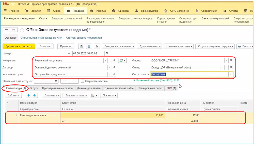 - Контрагент, Договор, Условия отгрузки, Фирма, Склад, Статус заказа - Согласован (после его согласования)