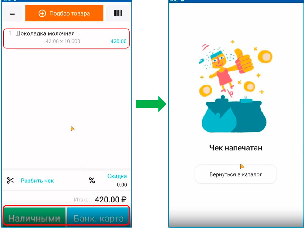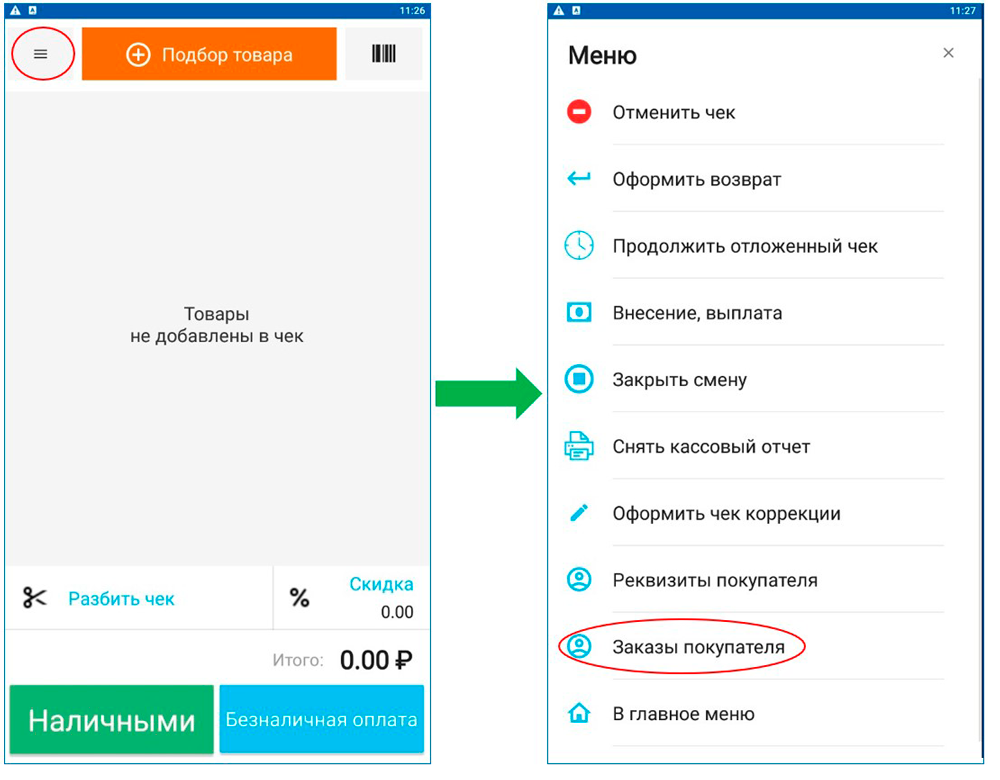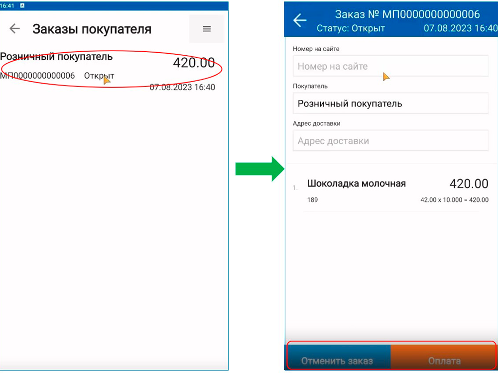 - После того, как вы нашли нужный заказ, вы можете: добавлять его в чек, провести оплату и отдавать товар покупателю: