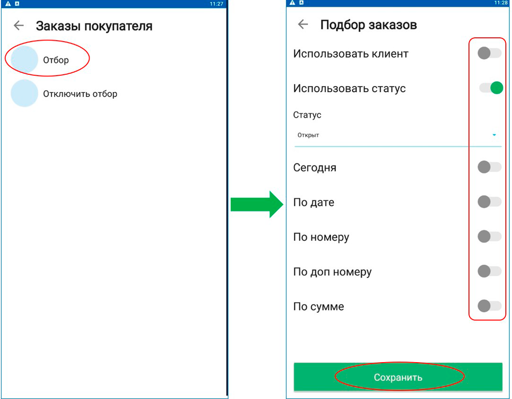 Здесь вам доступны фильтры: по Клиенту; по Статусу документа; Выбрать заказы именно сегодняшним днем; Подобрать конкретную дату заказа; По номеру заказа; По дополнительному номеру; По сумме документа: