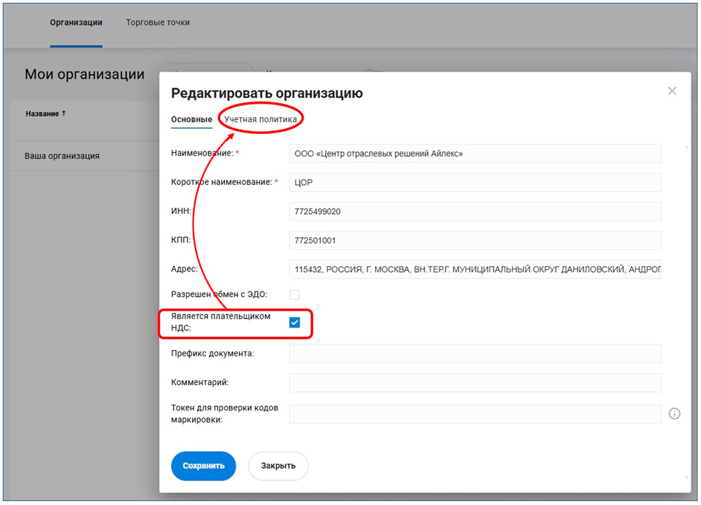 - Установите флаг "Является плательщиком НДС", для настройки учетной политики вашей организации: