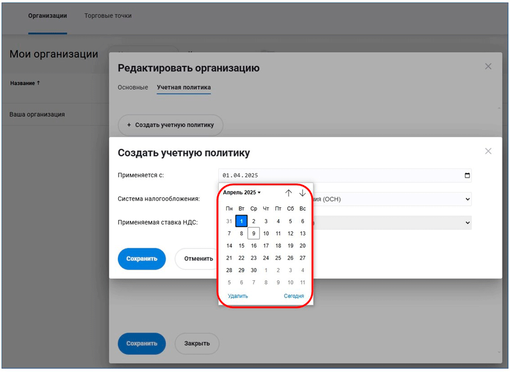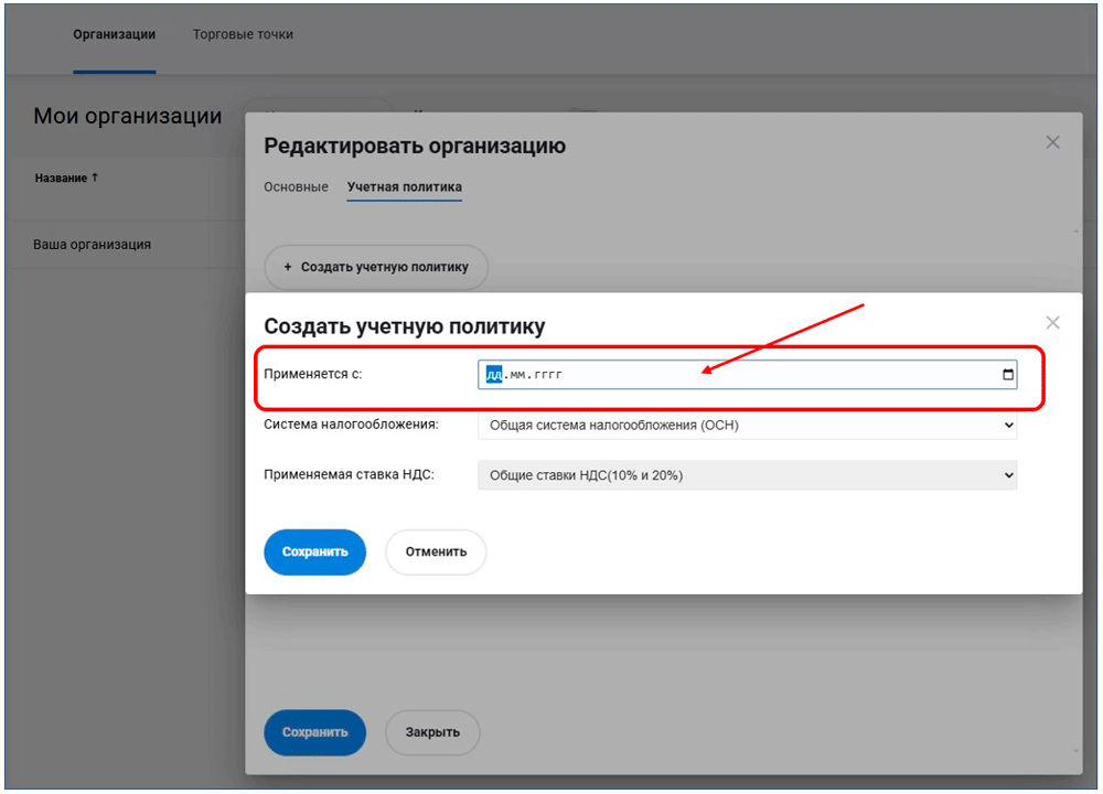 - Выберите дату, с которой применяется актуальная ставка по организации: