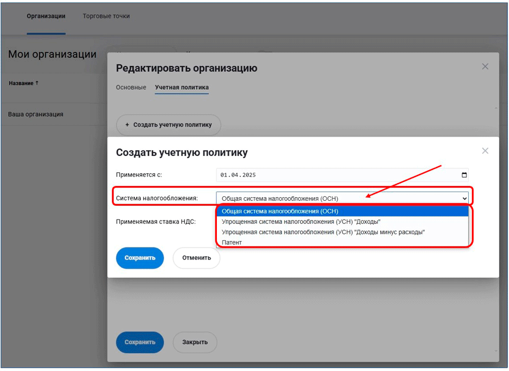 - Нажмите на поле "Система налогообложения" - выберите актуальную для вашей организации:
