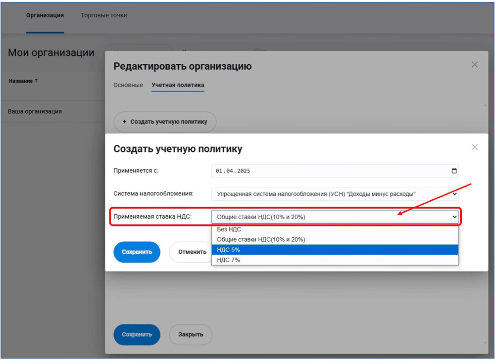 - Нажмите на поле "Применяемая ставка НДС" - выберите актуальную для вашей организации: