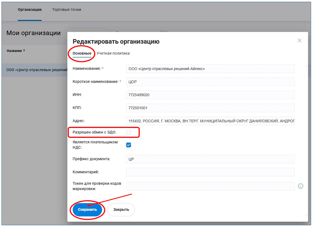 - Если настройка обмена с ЭДО на данный момент не актуальна - нажмите кнопку "Сохранить" для завершения добавления организации: