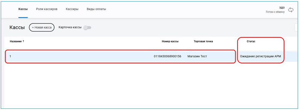 - Сейчас вы видите в колонке "Статус", что добавленная вами касса ожидает регистрации: