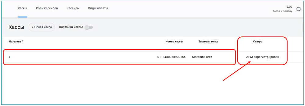 - Теперь вы видите в колонке Статус - касса зарегистрирована: