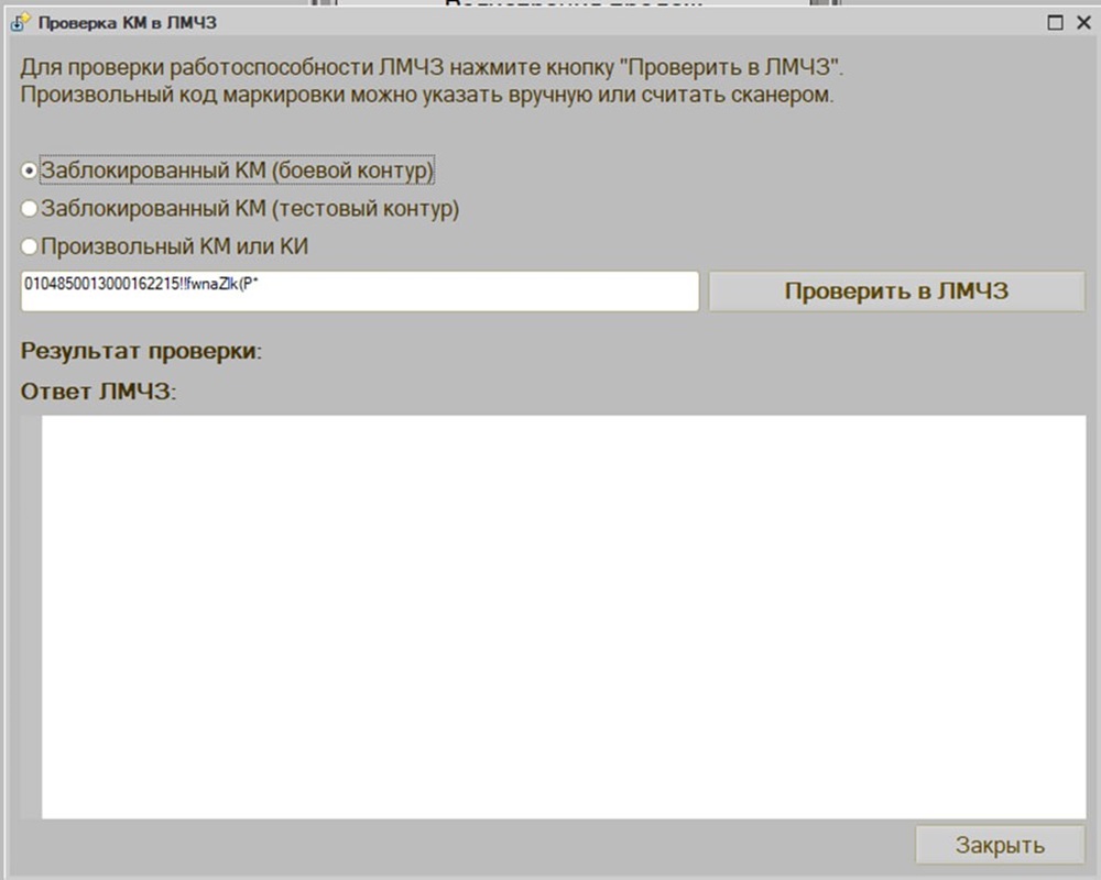 Для проверки работы ЛМЧЗ нужно нажать на "Тест проверки КМ в ЛМЧЗ" и выполнить проверку работы