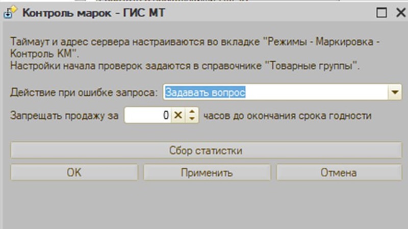 Нажать "Настройка контроля кодов маркировки". В открывшемся окне следующие настройки: