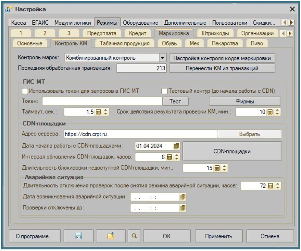 1. Если используется несколько фирм, можно не заполнять токен во вкладке Контроль КМ, но можно и заполнить, если по секции не нашлась фирма, то будет использоваться он