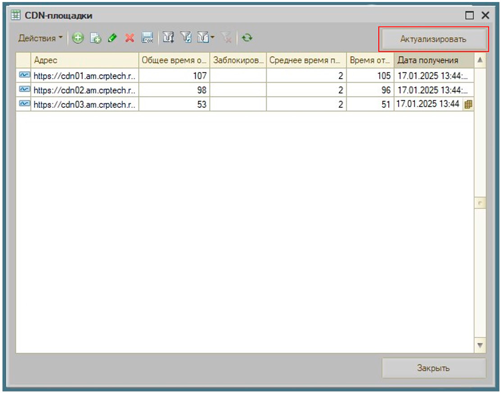 По кнопке "Актуализировать" выполнится обновление списка площадок