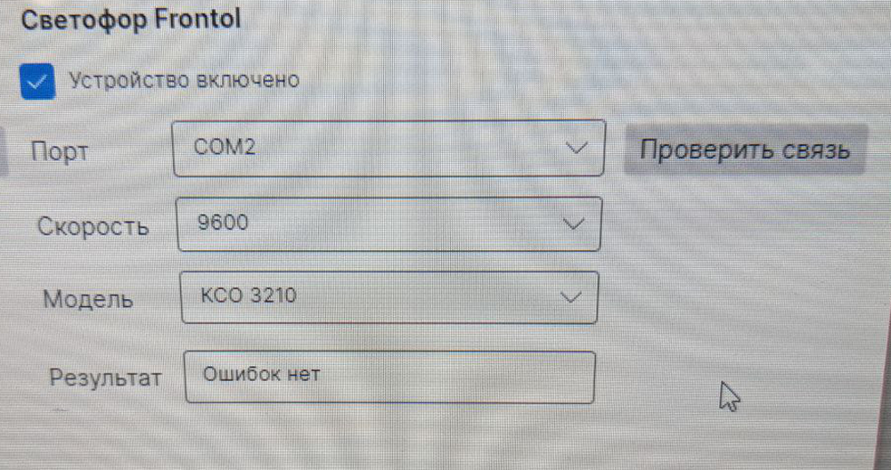 - На закладке "Устройства" в разделе "Cветофор Frontol" установите флаг устройство включено