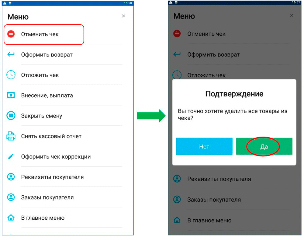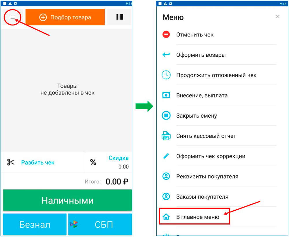 - В режиме продажи - нажмите на значок меню в левом верхнем углу для выхода из режима продажи
