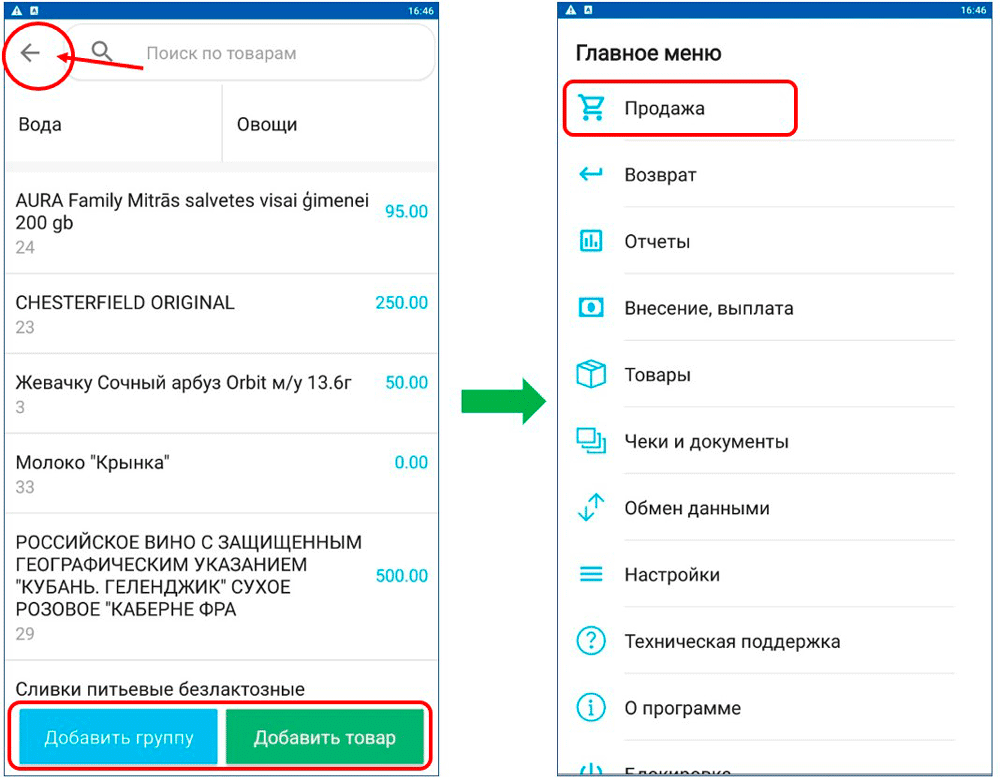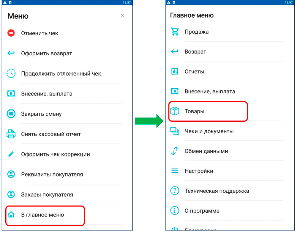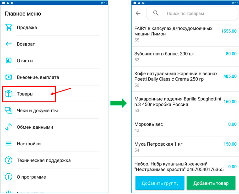 - В главном меню нажмите "Товары" для перехода в справочник товаров