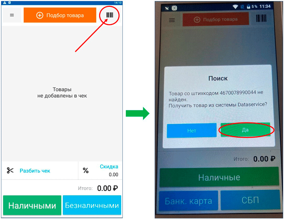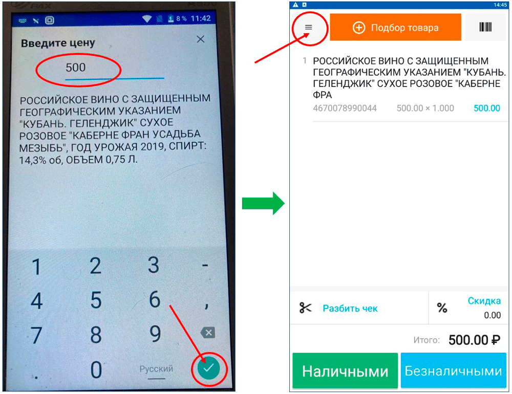 - В режиме продажи, отсканируйте штрихкод на алкогольном товаре, для это нажмите на значок штрихкода в правом верхнем углу, если у вас встроенный в кассу сканер или отсканируйте штрихкод подключенным сканером штрихкодов,