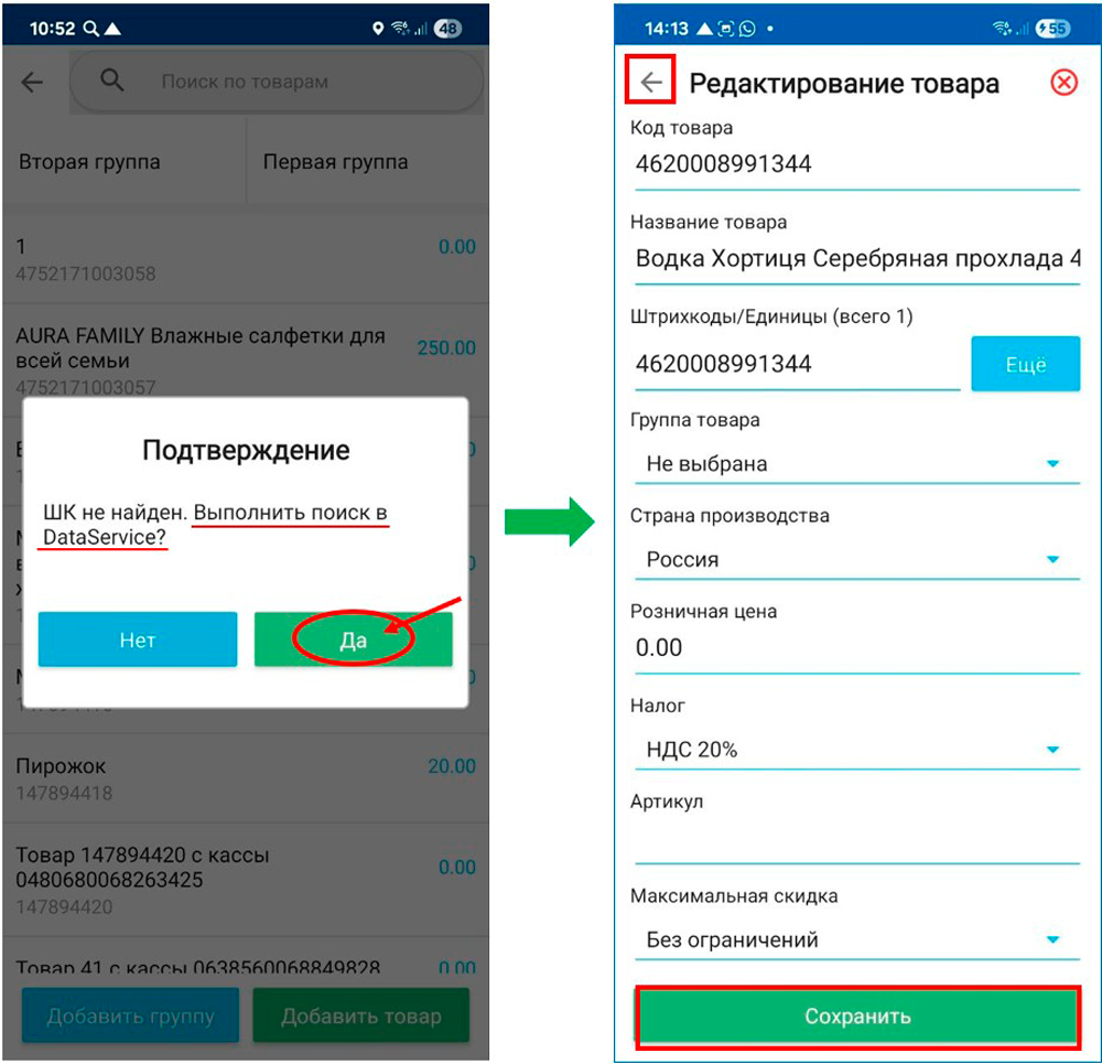 Нажмите "Сохранить" или стрелку в левом верхнем углу для добавления товара в справочник.
