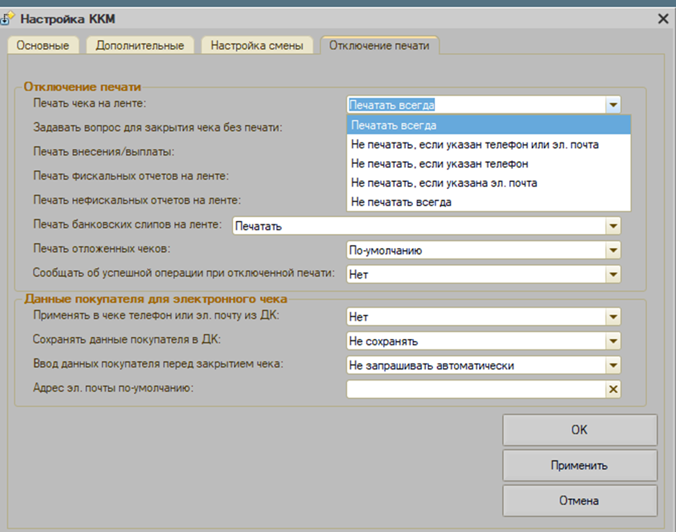 Не печатать, если указан email – чек не печатается при указании email покупателя.