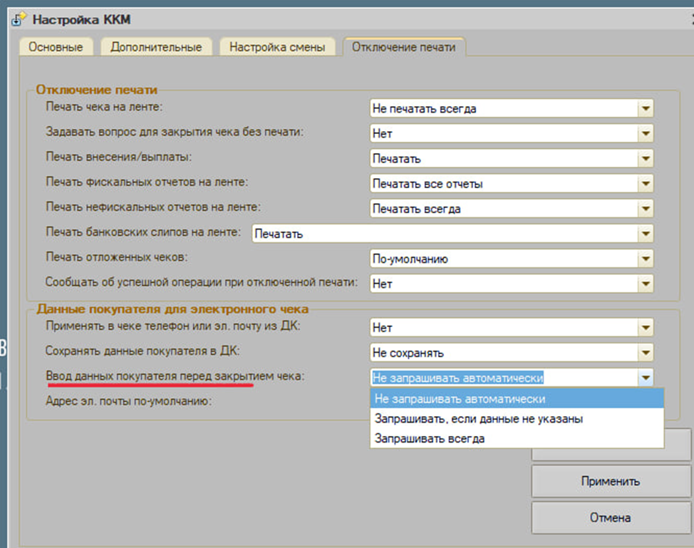 Найдите вкладку «Отключение печати». Здесь вы сможете настроить параметры печати чеков.