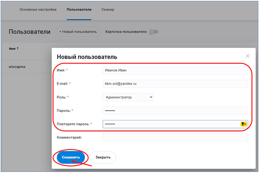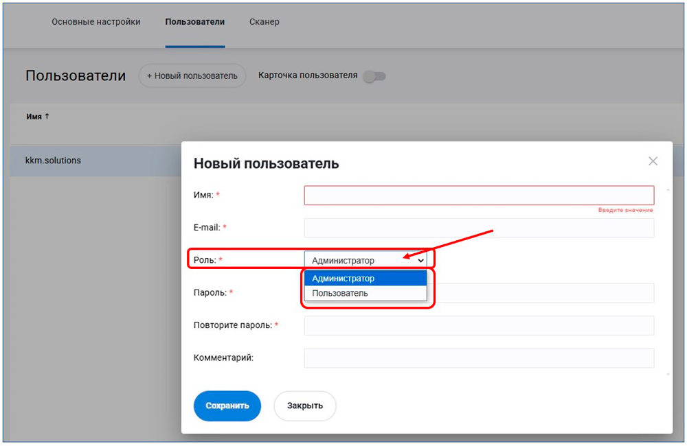 - Обращаем ваше внимание на выбор роли для нового пользователя: Администратор - пользователь будет со всеми правами, роль "Пользователь" - ограничен в правах только тем, что не может добавлять и удалять пользователей.