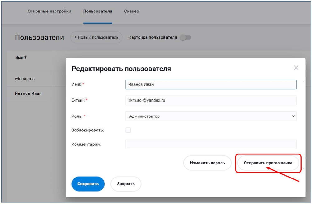 - Нажмите на кнопку " Отправить приглашение" для отправления письма на электронную почту новому пользователю: