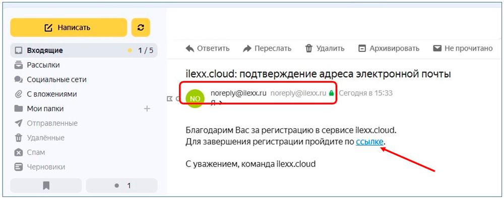 - Новый пользователь получает письмо на электронную почту от отправителя "noreply@ilexx.ru", для подтверждения почты ему нужно перейти по ссылке в письме: