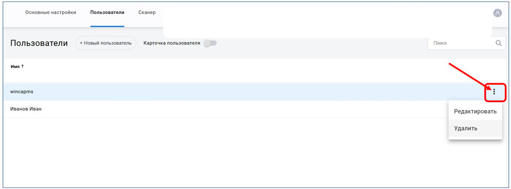 - Если вам нужно удалить или отредактировать данные пользователя - нажмите на троеточие в строке нужного пользователя для выбора действия с его карточкой: