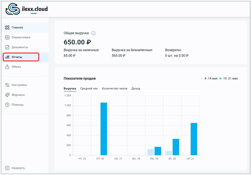 Продуктивность работы ваших организаций и точек торговли можно анализировать в разделе "Отчеты".
