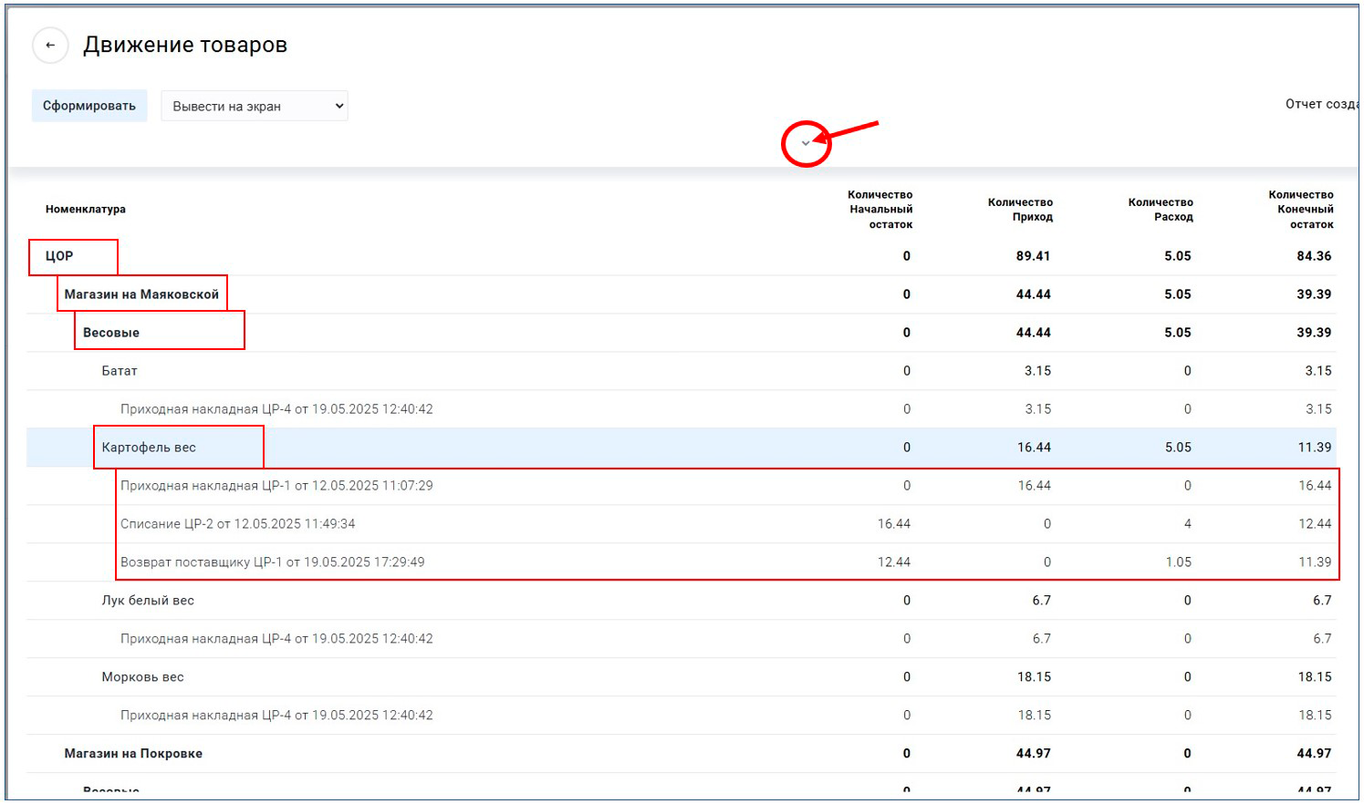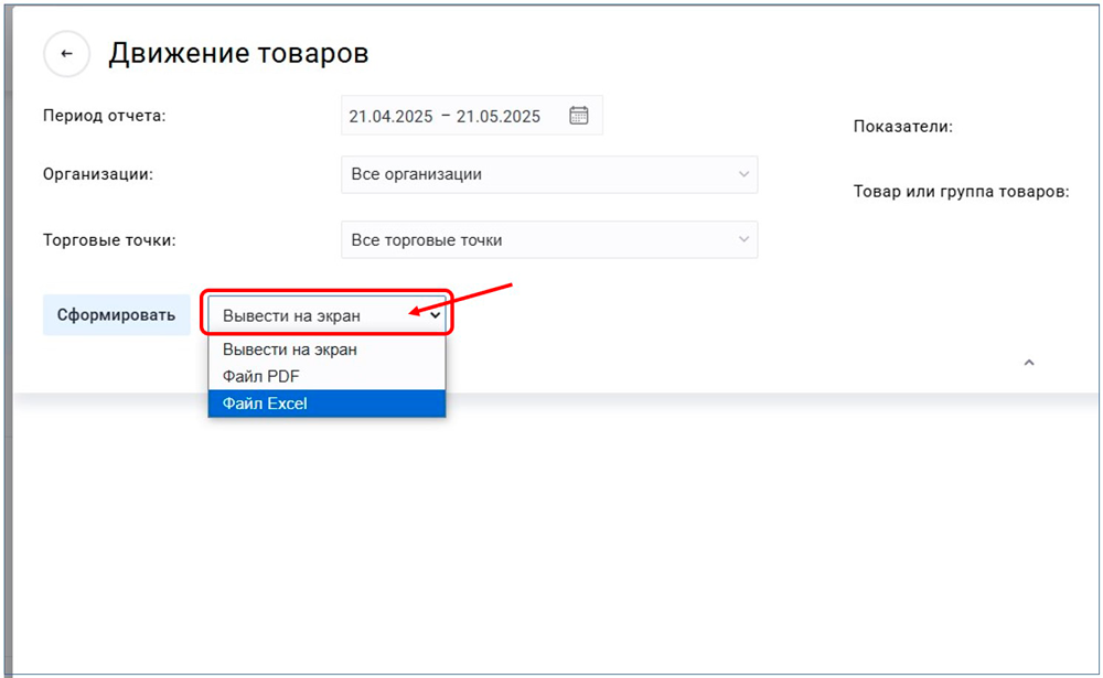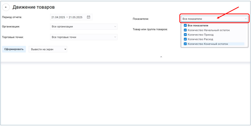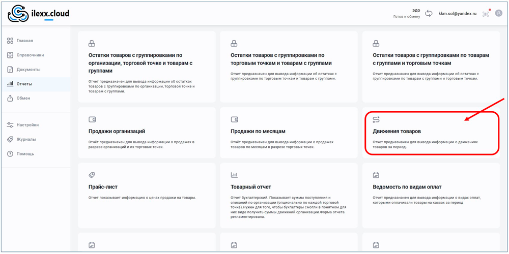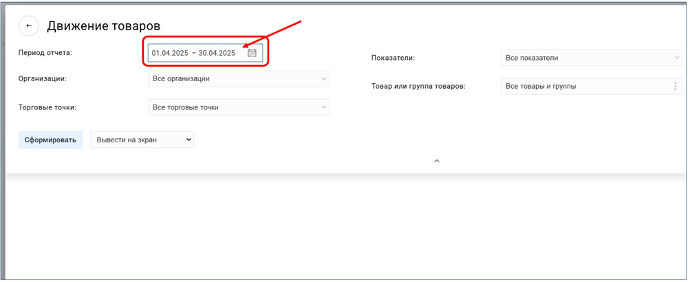 - Выберите отчет "Движения товаров" для получения информации за нужный период: