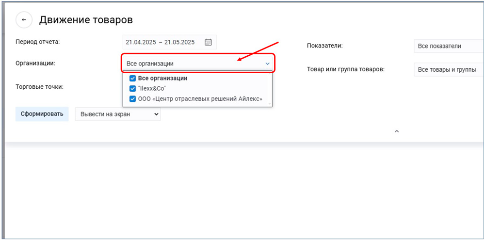 - В появившемся списке, при условии, что у вас две или более организации - выберите организацию или оставьте все, по которым нужно создать отчет: