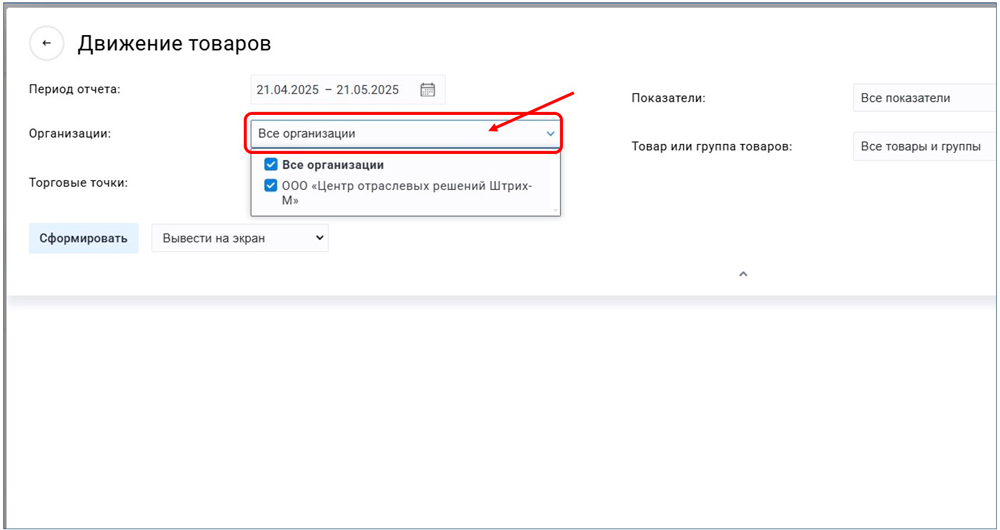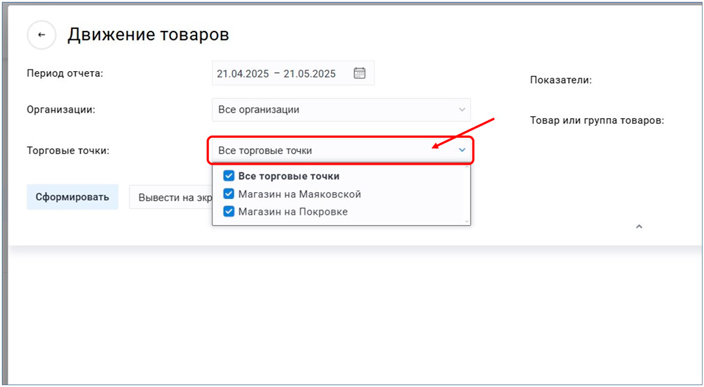- В строке "Торговые точки", нажмите на поле с надписью "Все торговые точки" для выбора торговой точки, по которой вам нужно создать отчет или выберите все торговые точки по умолчанию: