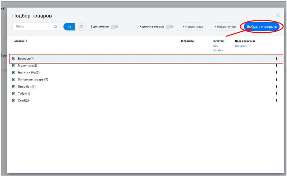 - После выбора товара или группы товаров - нажмите кнопку "Выбрать и закрыть":