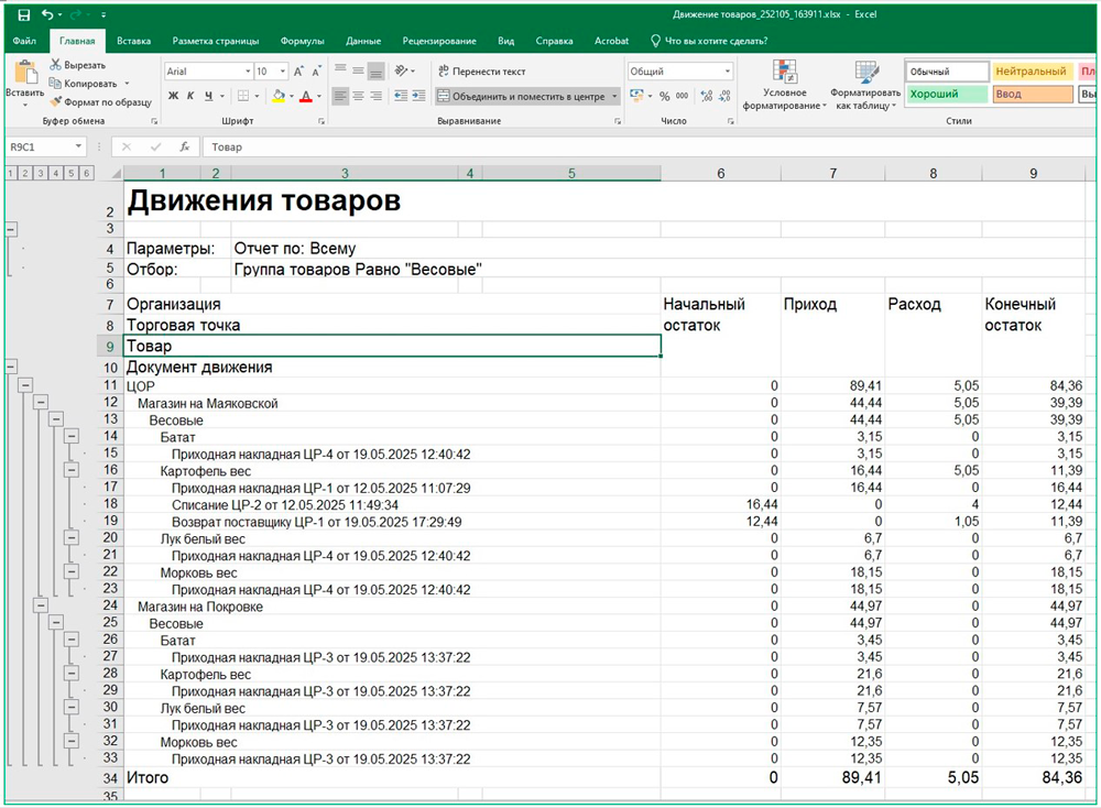 - В столбцах отчета отражены начальные остатки по каждому товару, а также приход, расход и конечный остаток: