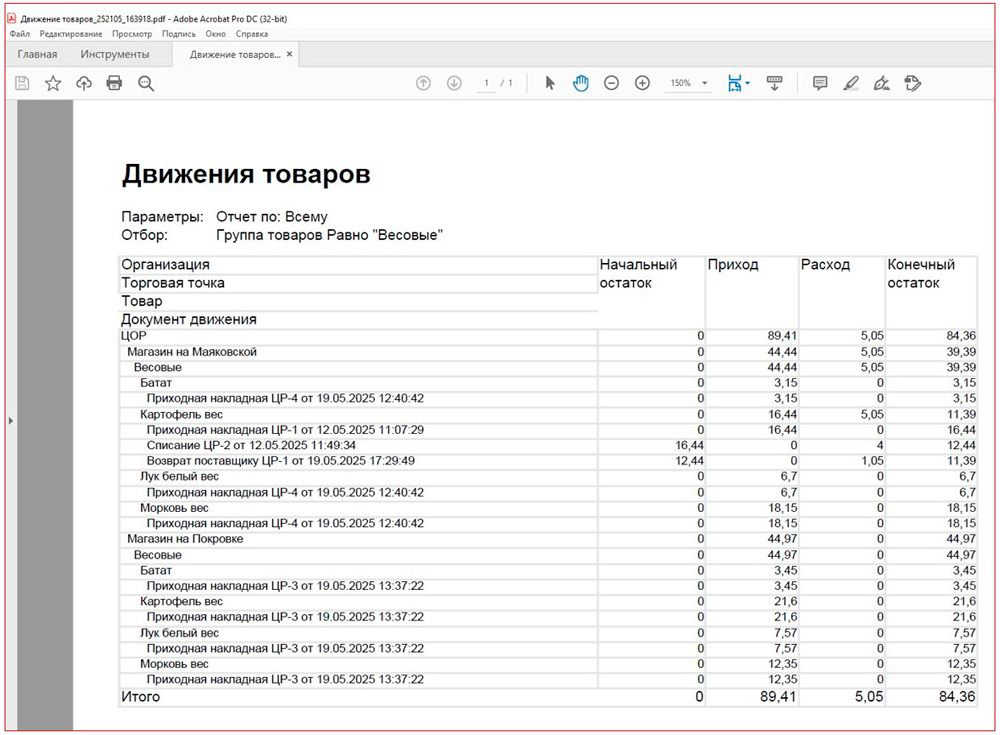 - В начале отчета указано название вашей организации, ниже идет разбивка по торговым точкам, группе товаров и товарам, входящим в эту группу, а уже в каждом товаре идет разбивка по приходу, списанию, расходу, возврату и перемещению - если таковые действия проводились в указанный период,