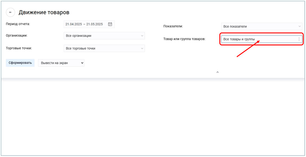 - Нажмите на поле "Все товары и группы" для выбора товара или группы товаров, по которой вы планируете получить отчет: