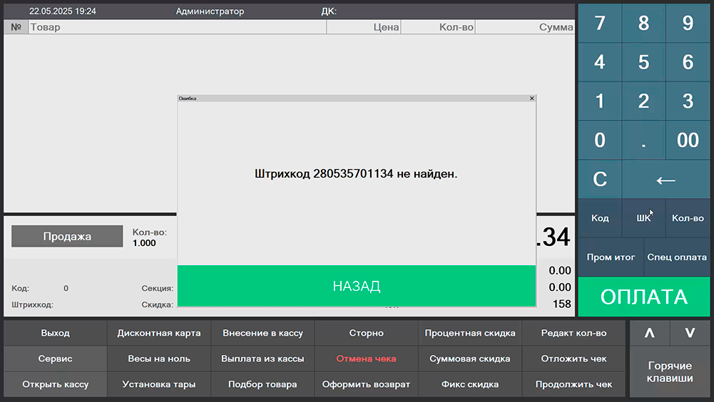 Когда мы сканируем этот штрих-код на кассе, получаем сообщение о том, что такой штрих-код не найден. По формату «код-цена», Кассир 5 пытается найти у нас товар с кодом 05357, но такого у нас нет.