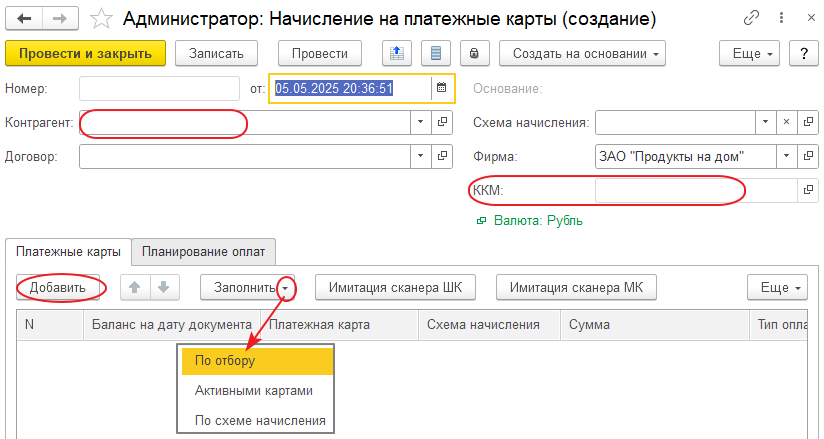 При заполнении реквизита «Схема начисления» выбором элемента справочника «Схемы начисления средств на платежные карты» реквизиты «Контрагент» и «Договор» заполняются значениями «Контрагент» и «Договор» из группы «Параметры взаиморасчетов при начислении на карты» выбранного элемента справочника. При этом в табличной части документа для выбора будут доступны только платежные карты с данной схемой начисления. Если выбрана схема начисления с указанием, что надо начислять долг, то при проведении документа по контрагенту делаются движения по регистру взаиморасчеты.