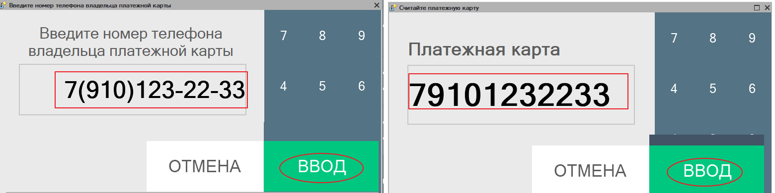 После нажатия кнопки «Оплата» выводится форма для ввода номера платежной карты. Форма ввода номера платежной карты зависит от флага у реквизита «Использовать номер телефона как номер платежной карты» (закладка «Режимы» → вкладка «Кредит» настроек «Кассир 5»). Если флаг у реквизита задан, то в форме задания номера платежной карты будет выведен шаблон для ввода номера телефона покупателя. Если флаг у реквизита «Использовать номер телефона как номер платежной карты» не задан, то номер карты вводится без шаблона – если номер карты при этом определяется номером телефона, то следует вначале указать цифру «7».