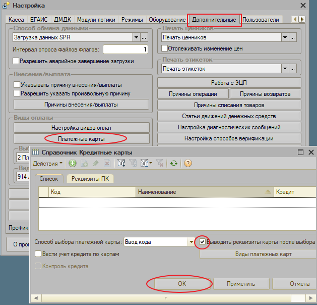 Если в справочник «Кредитные карты» (закладка «Дополнительные» команда «Платежные карты») установить флаг «Выводить реквизиты карты после выбора», то после ввода номера платежной карты, до отправки данных по оплате товара в долг, на экран кассы будет выведены реквизиты платежной карты. Это позволит увидеть баланс платежной карты без дополнительных указаний.